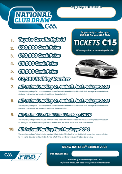 This is a ticket for the National GAA Club Draw, 100% of funds raised go directly to the club, and all entrants from all clubs in the country are entered into the draw which will take place in March 2026.